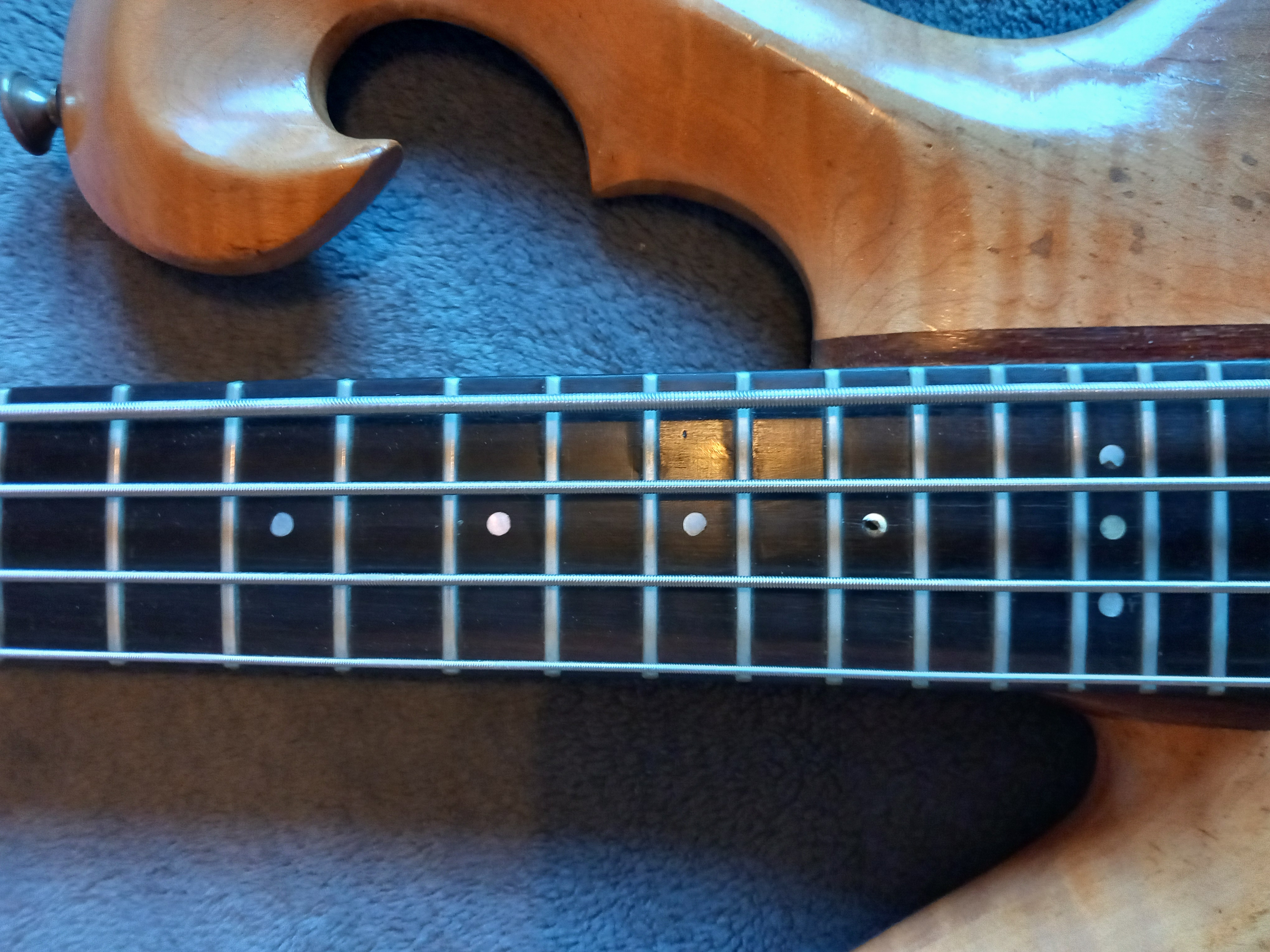 During the time that I had it, it was definitely played ALOT, I just took special care in maintaining it. Kiwi neutral shoe polish, a soft cloth, and a little spit. Orders from Carl himself. During the time that I had it, that bass never had any fancy hi shine glossy guitar sprays put on it. It was always hand rubbed, spit shinned, It was some what of a ritual when it came time to clean it, but well worth the extra effort. That hand rubbed spit shine finish left the natural wood feeling like silk. Never used any oils on it, so it never got any dark greasy build up stains on it.