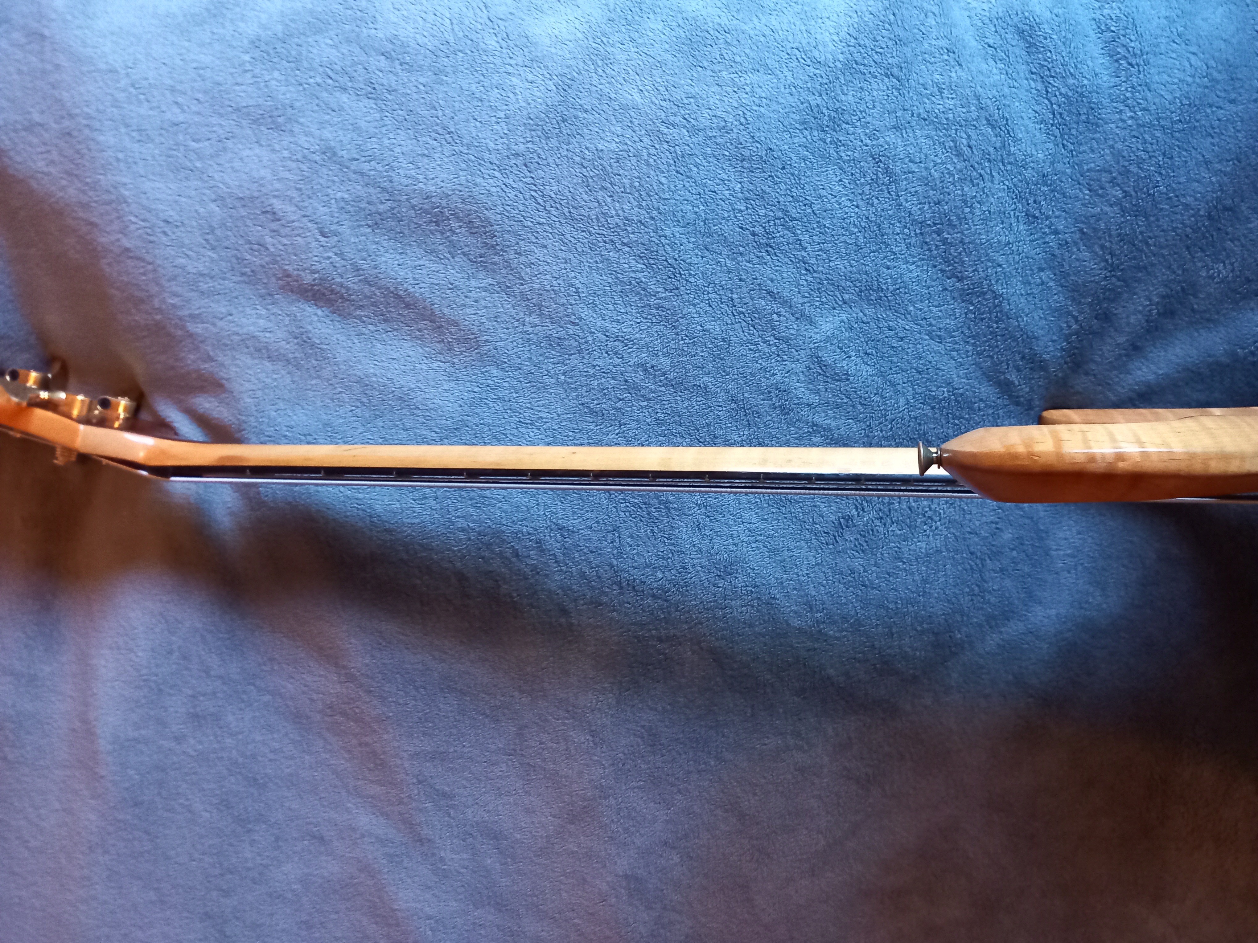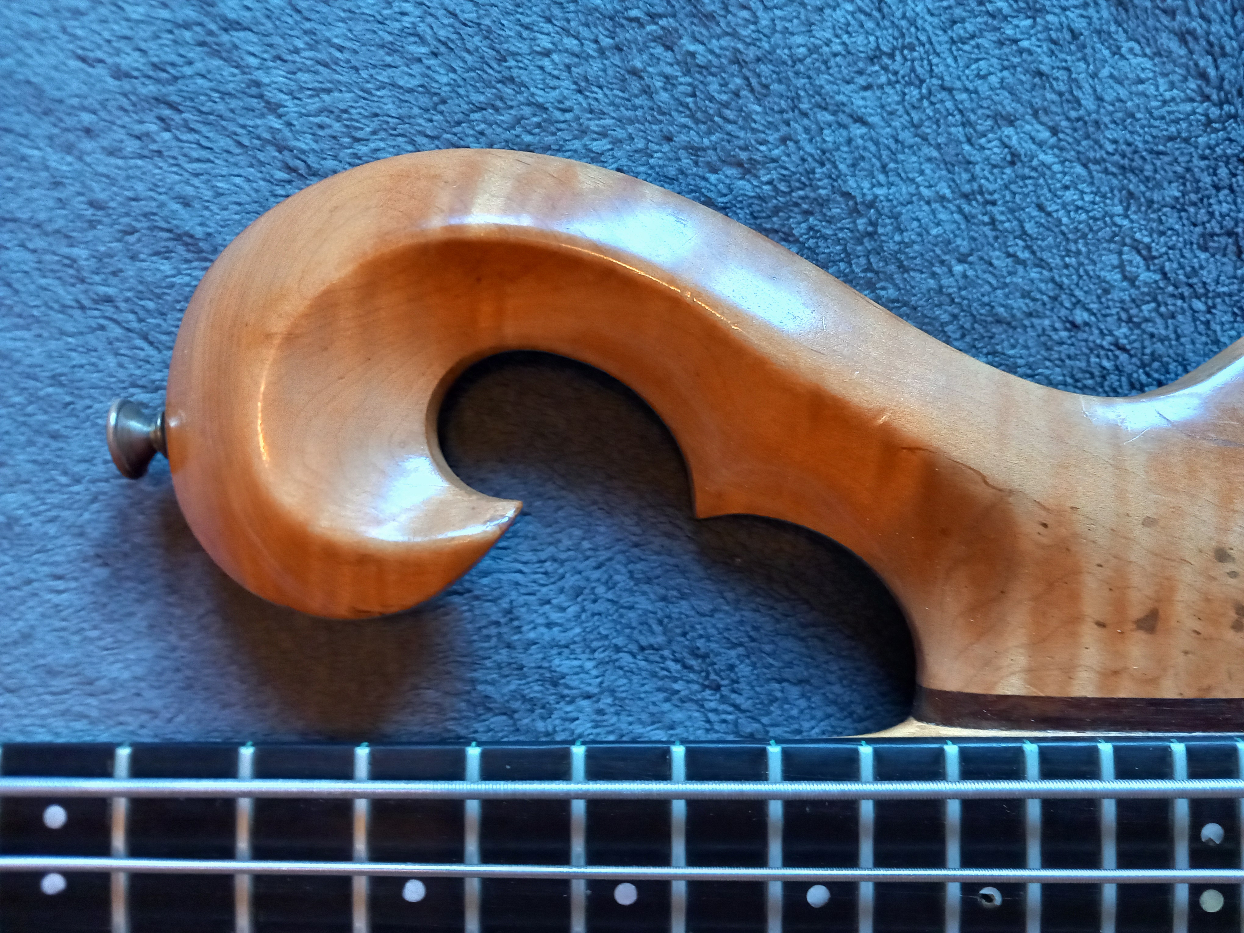 Took it home, but the neck was too thin and the headpiece came off. Back in the shop in 76. 6 months later, it was refitted with Maple neck and Rosewood fingerboard. A small strip of Ebony was left on the back as a detail.