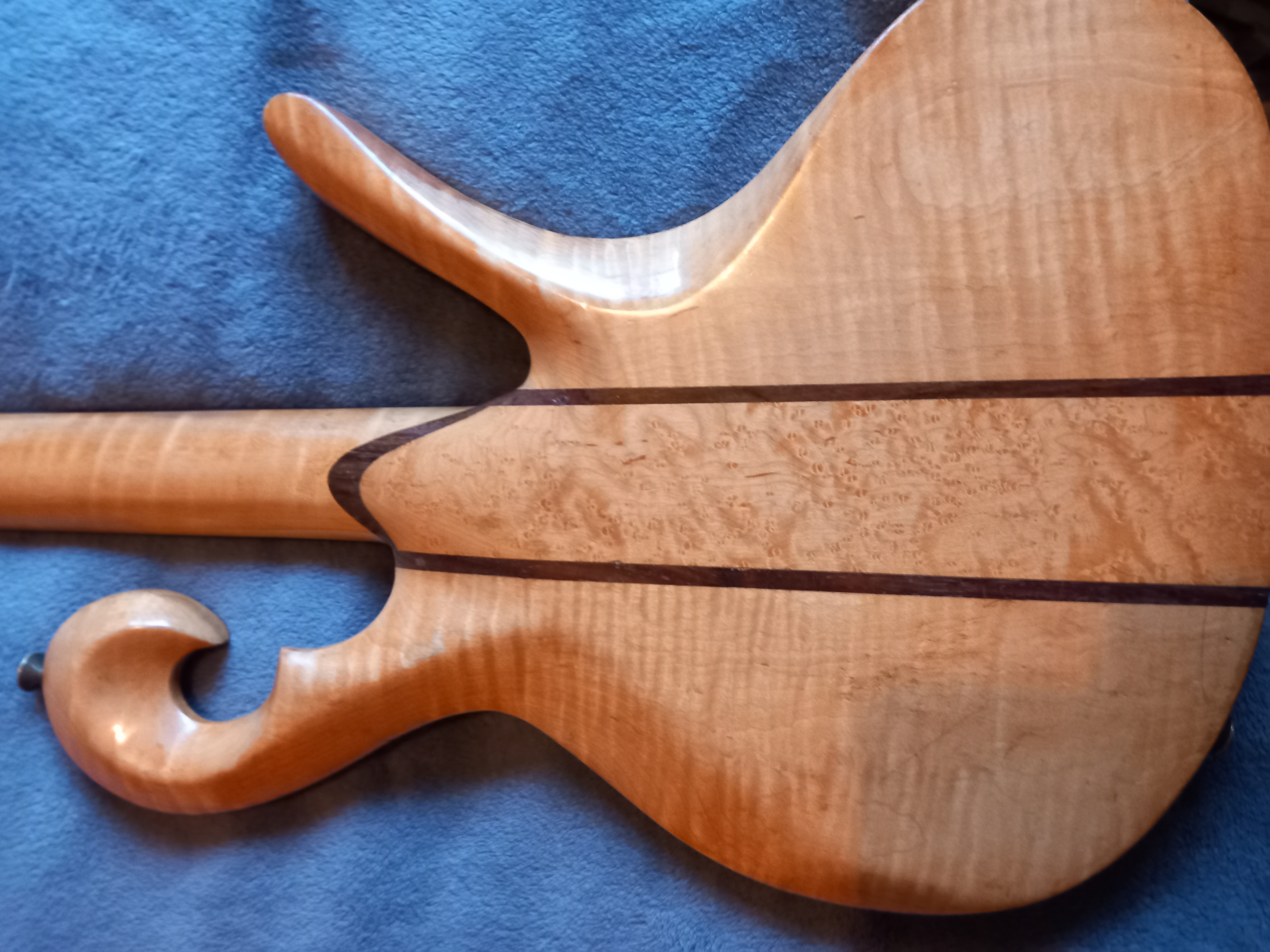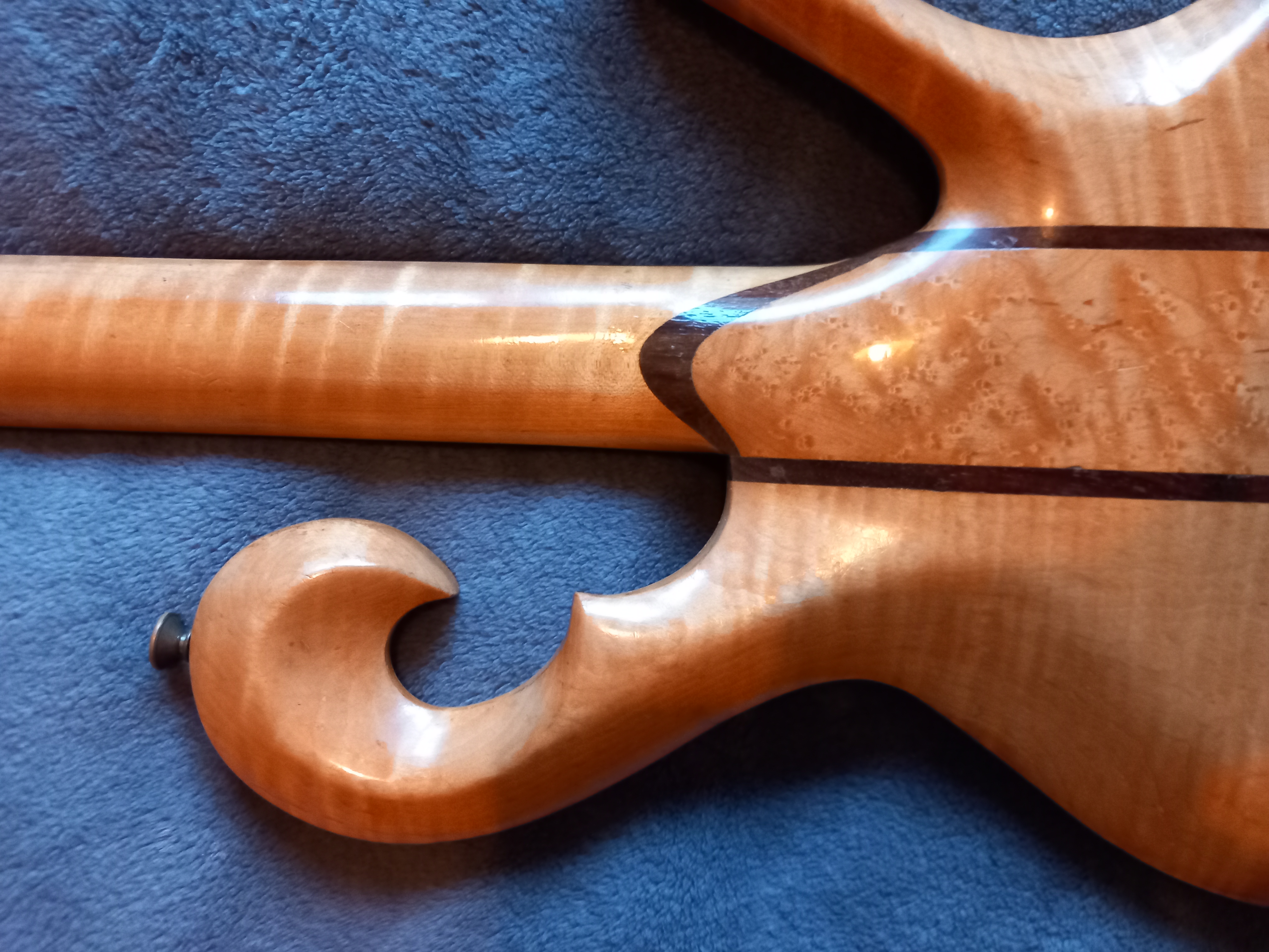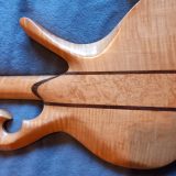 Alan proceeded to tell me a little about it and I can tell you it is made of ‘birdseye’ Maple with Rosewood inlay on the back that apparently is one continuous piece. I’ve looked for a join but can’t find one so it must be correct. The fingerboard is Ebony.