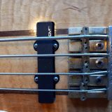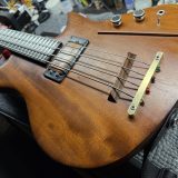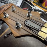 Played with a light touch, the bass plays well, with a nice resonance that can be felt through the body and the neck. The electronics are fully functional, and the bass has surprisingly little wear for an instrument over 25 years old. The frets were recently replaced by Mr. Thompson so they don’t have any noticeable playwear on them. From a players perspective, the most unusual feature of this bass is the almost “squarish” profile of the neck. It’s not uncomfortable, but definitely different from what I’m used to and it took me a couple days to get used to it. The neck is quite shallow at the nut and gradually becomes thicker as you work your way up the neck – in fact the heel of the bass is integrated into the neck’s profile in such a way that the neck is nearly the full thickness of the body at the 20th fret position. The bass has a very powerful, present sound with a focused midrange – very old school! The toggle seems to switch the coils in and out of phase, resulting in both wide/fat and focused/bright sounds, and also has a standby mode. The Schaller pickup has an unappealing quirk that won’t endear it to players who do a lot of note bending – the strings tend to fall out the magnetic field when moved decisively from side to side – it’s possible to simulate an almost tremolo-type effect.