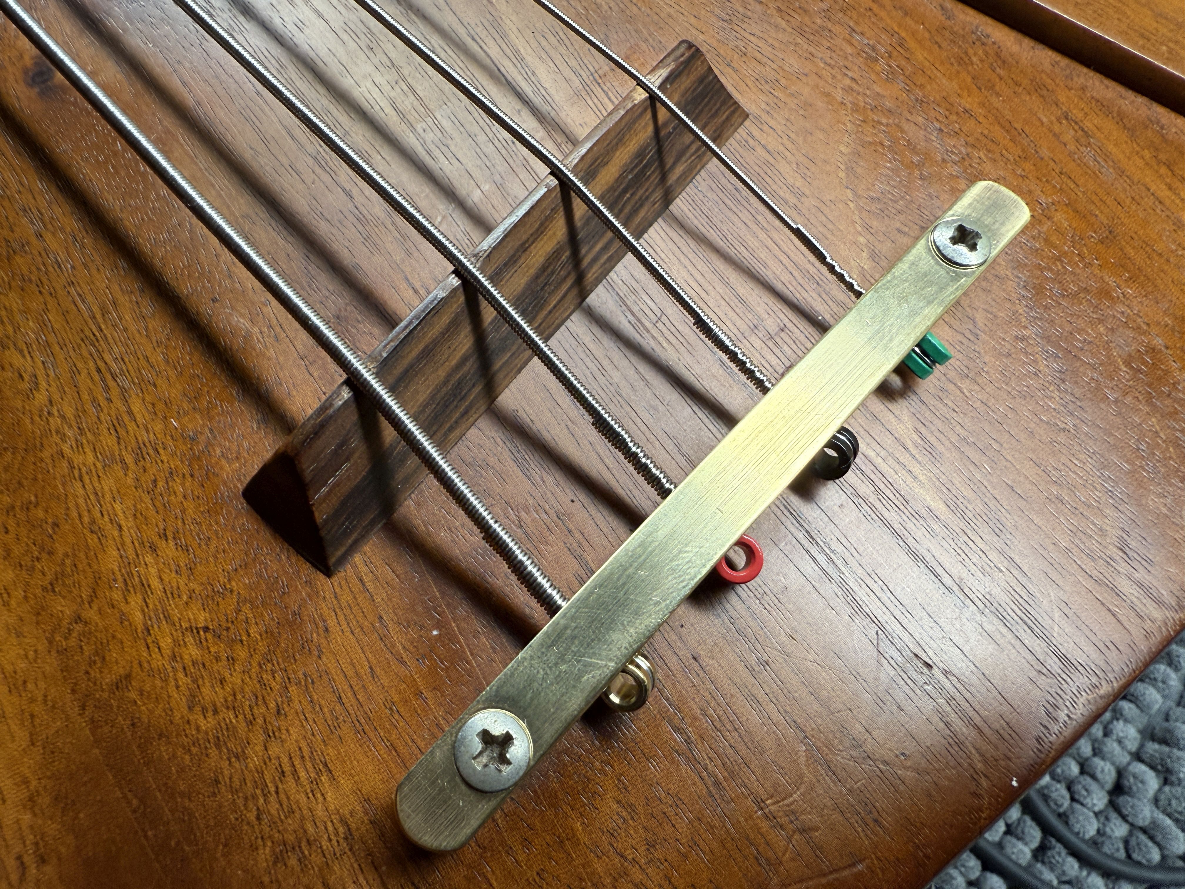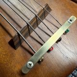 The handmade ebony and brass bridge, an essential aspect of this bass’s design, has a little story of it’s own. For at least part of its life this bass had a BadAss I bridge attached to it. There are photographs of this bass with the BadAss bridge at the Carl Thompson bass website (see note below). Recently the bass has been restored back to the original intended design by Carl himself. Notice the three dot inlays now on the bridge are in the same locatiion as the screws from the BadAss bridge, an elegant solution that visually rhymes with the three-dot 12 and 24 fret markers. This work was done at the same time when he replaced the frets, so everything on this bass is 100% original Carl Thompson. When restoring the bridge, he also made additional/alternate bridge saddles for this bass, so these are also included.