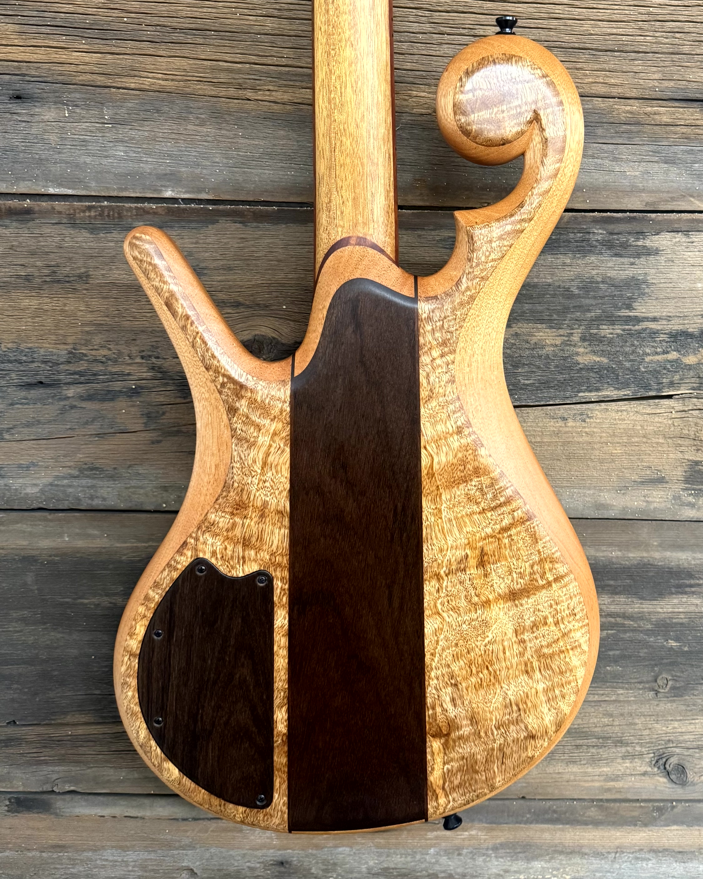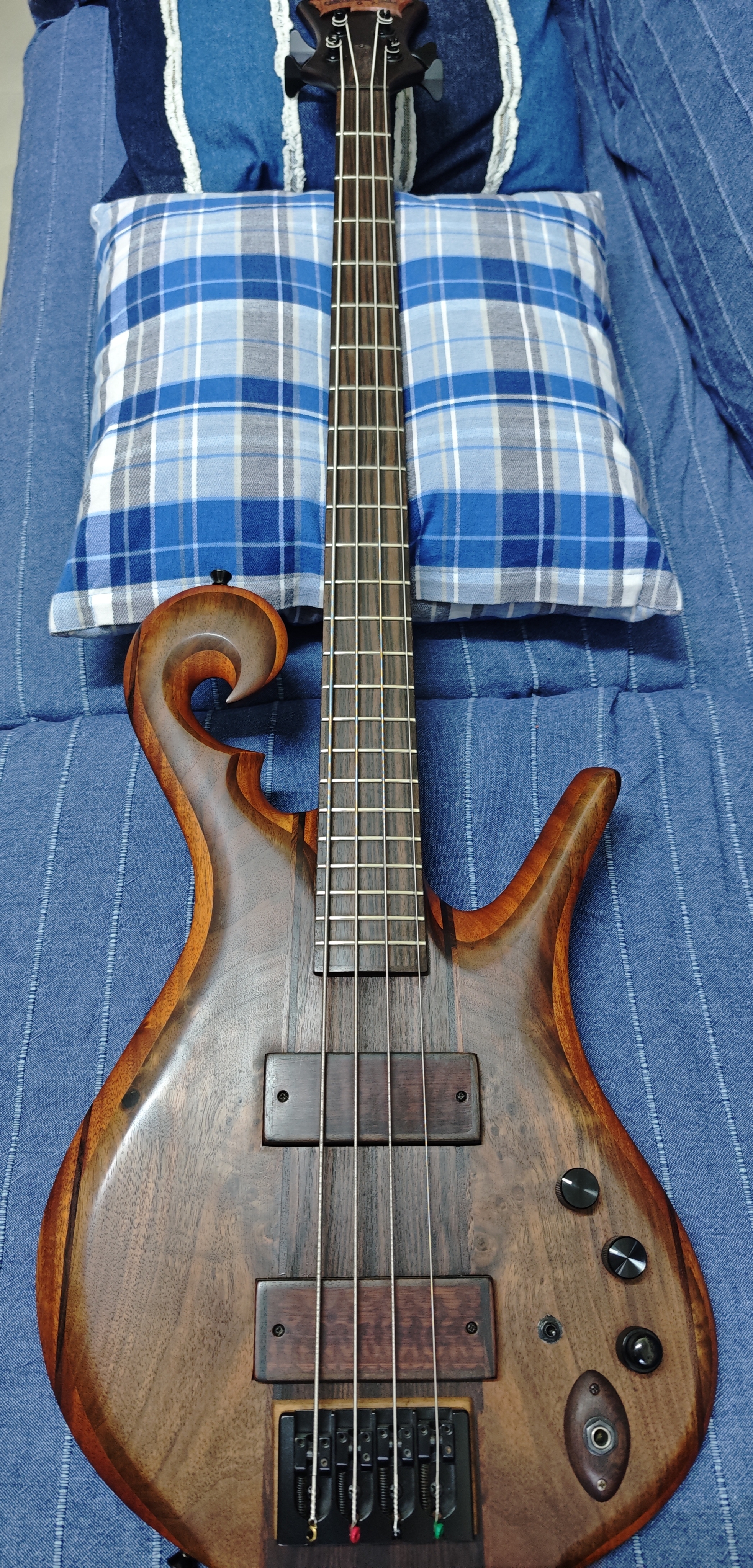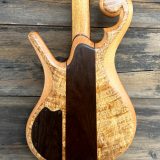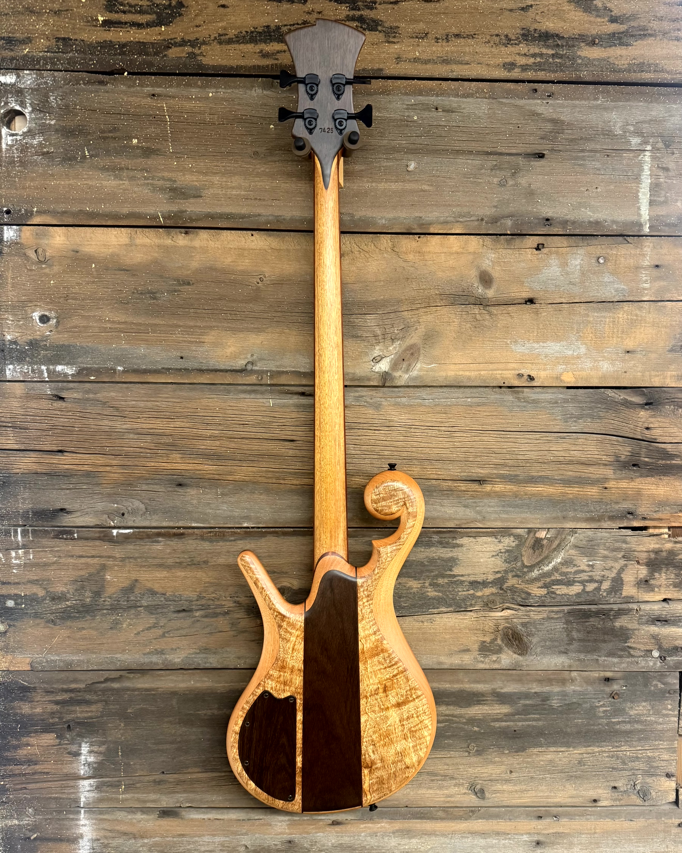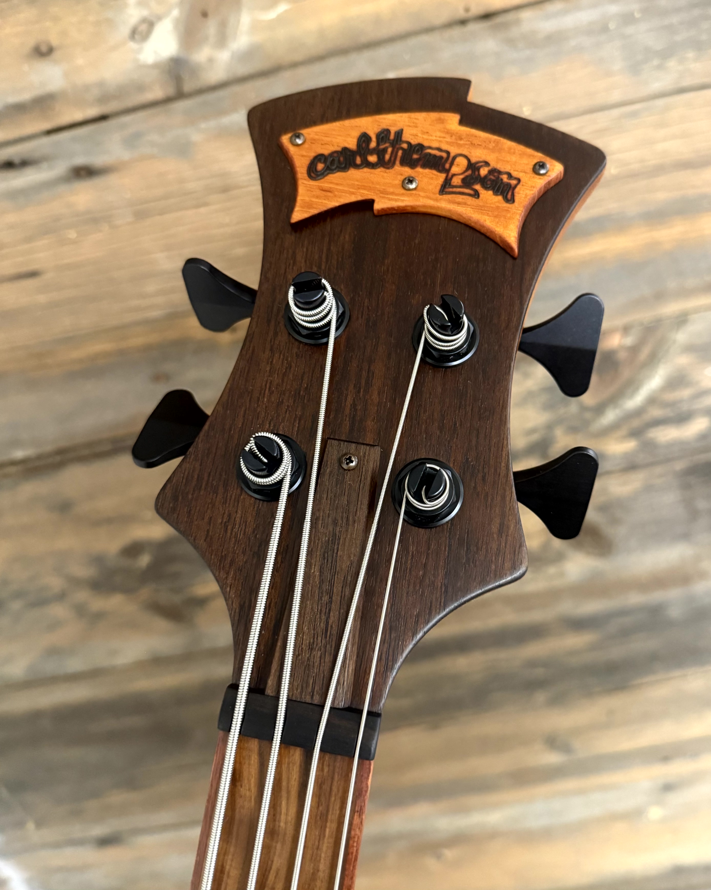 It has a black walnut body with curly maple stripes, maple neck with ebony fingerboard, curly maple/ebony headstock. The bass features a Kent Armstrong pickup with and ebony cover with cocobolo stripes. The nut is also ebony and cocobolo. The name plate and control covers are both black walnut and the heel block is ebony. Hipshot tuners and bridge.