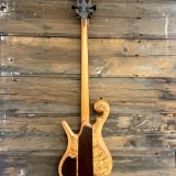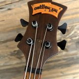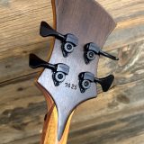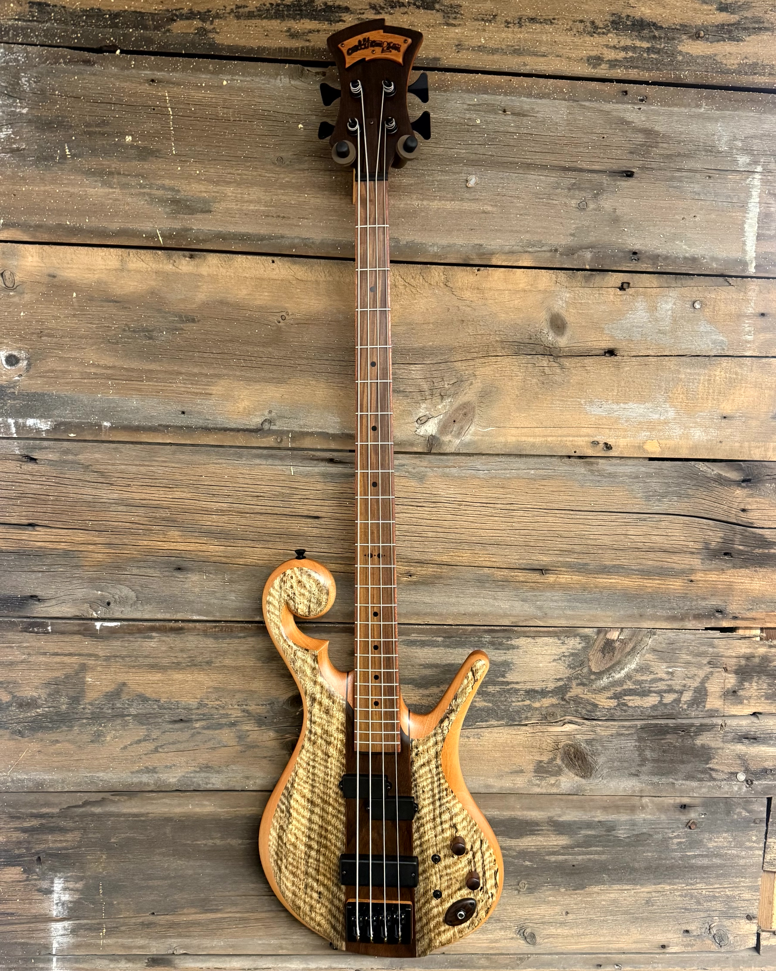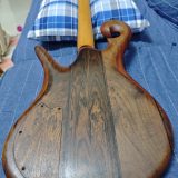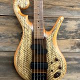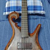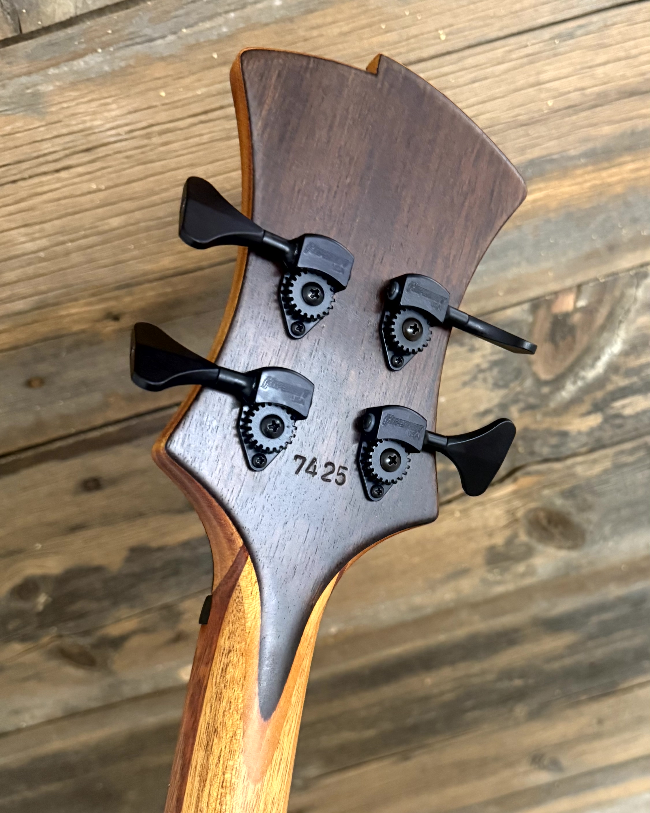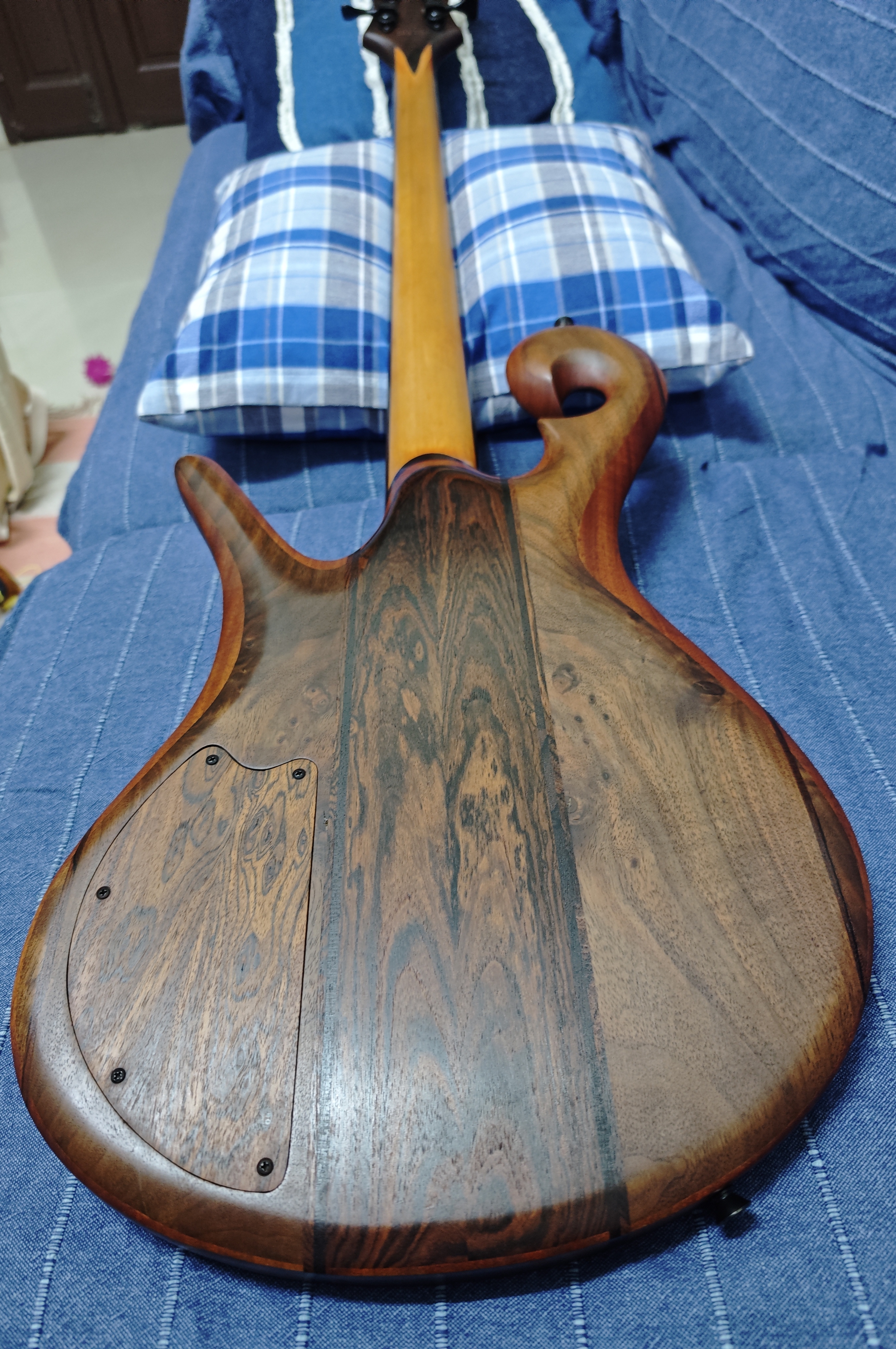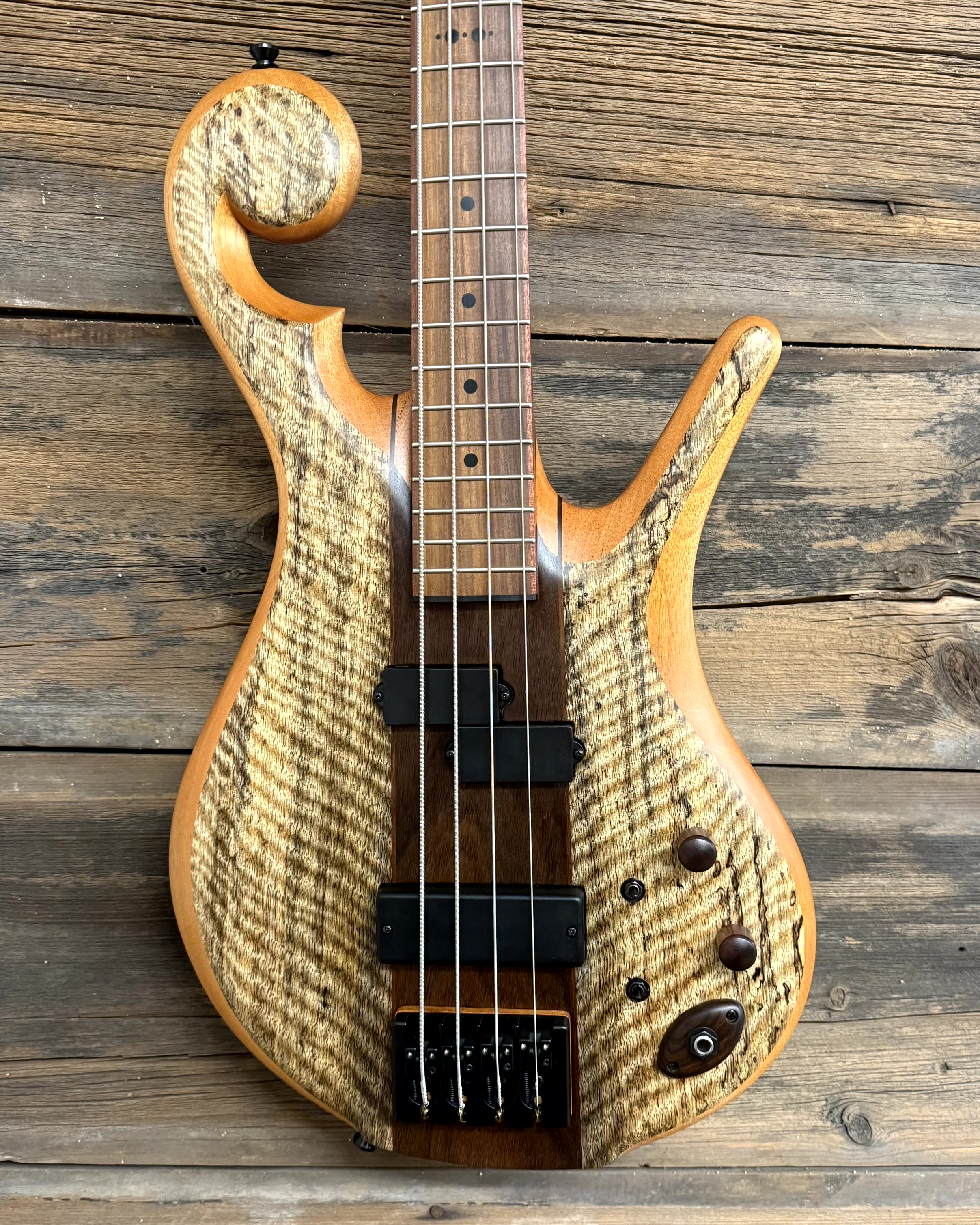 It has a black walnut body with curly maple stripes, maple neck with ebony fingerboard, curly maple/ebony headstock. The bass features a Kent Armstrong pickup with and ebony cover with cocobolo stripes. The nut is also ebony and cocobolo. The name plate and control covers are both black walnut and the heel block is ebony. Hipshot tuners and bridge.
