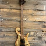 Multi-laminate exotic wood top and back with a maple core and rainbow cat’s eyes. Paduak neck with wood binding and pau ferro fingerboard. 36″ scale with 24 fret markets. Dual coil passive pickups.