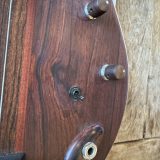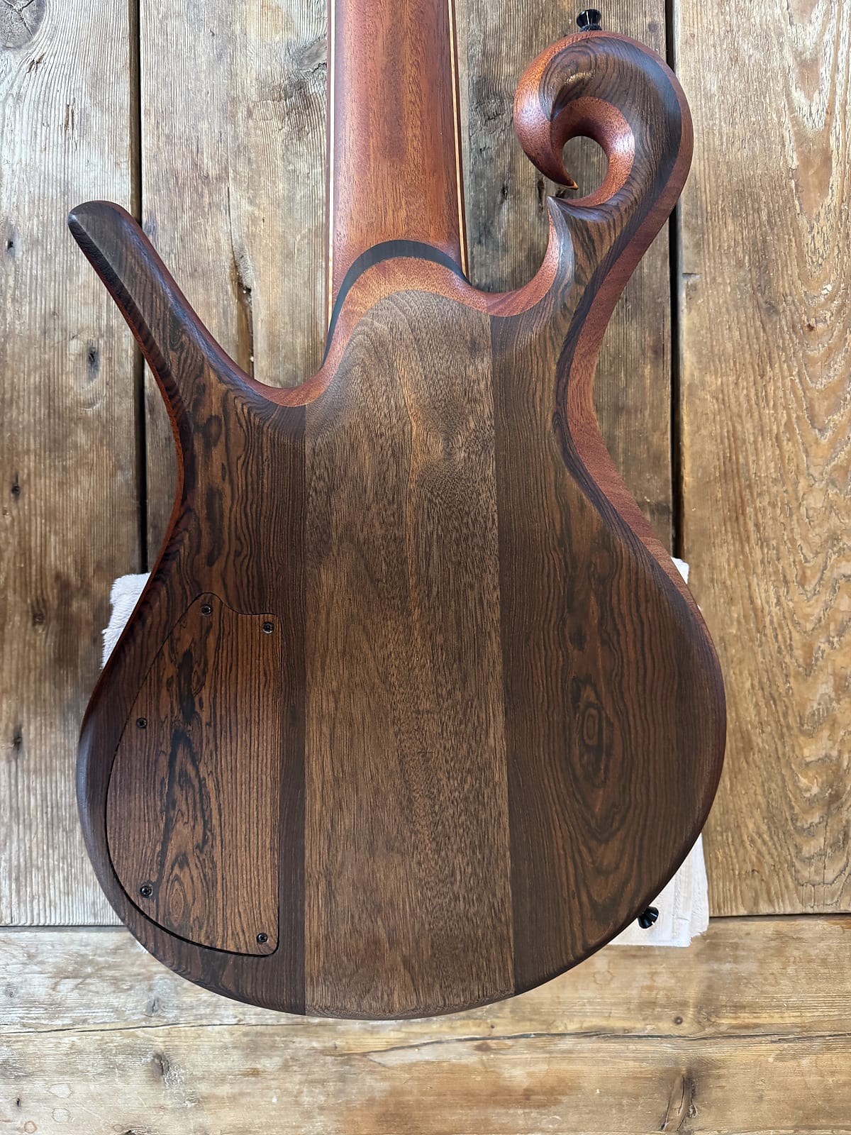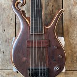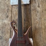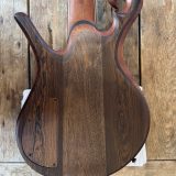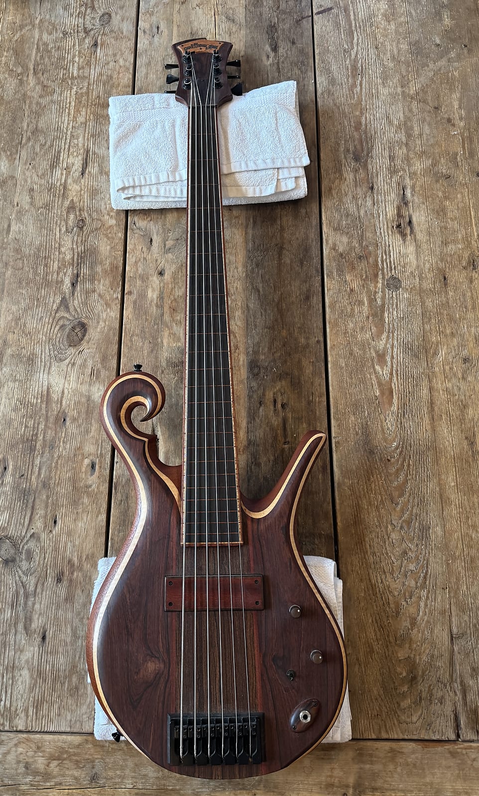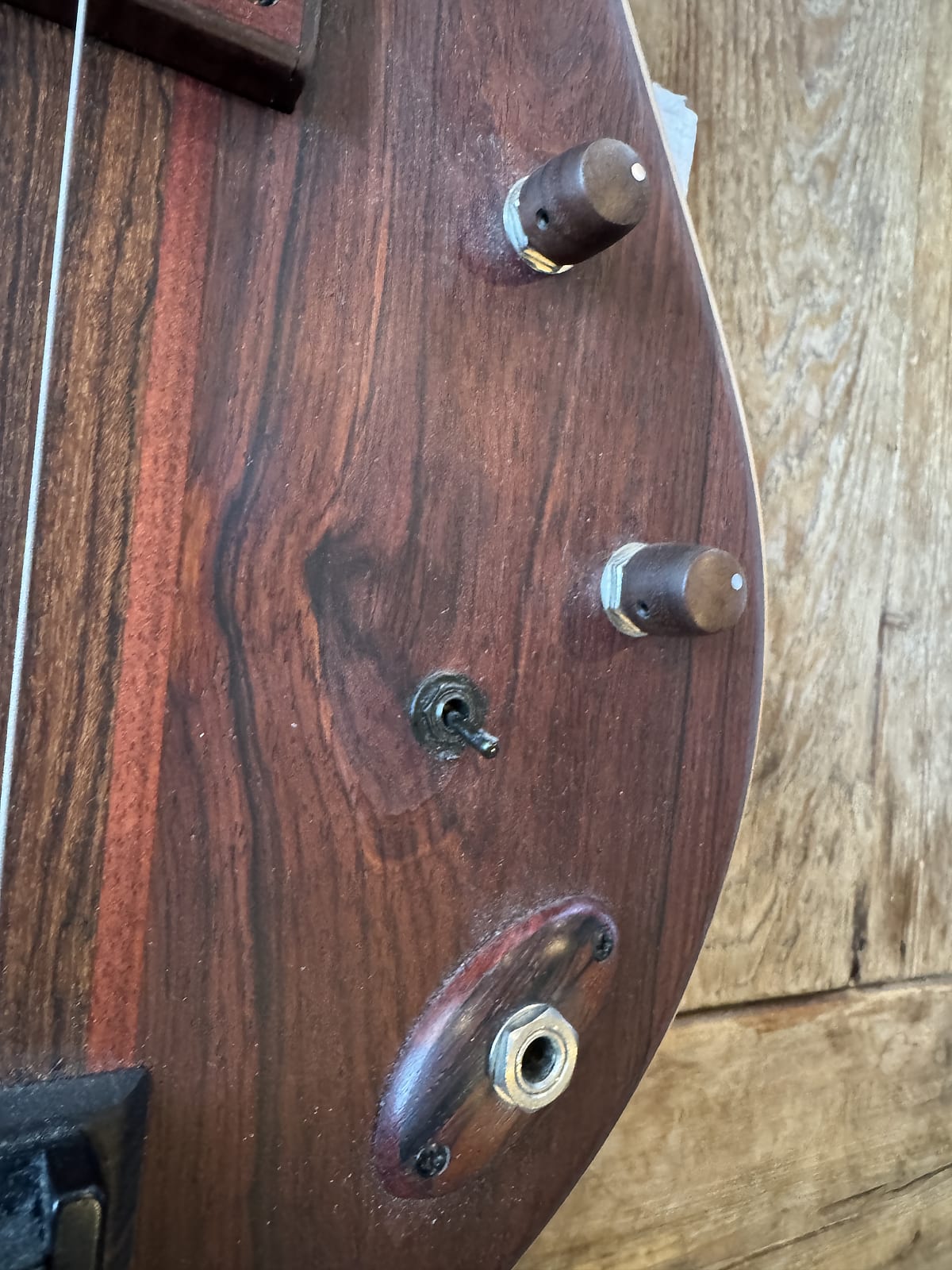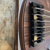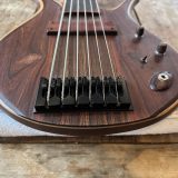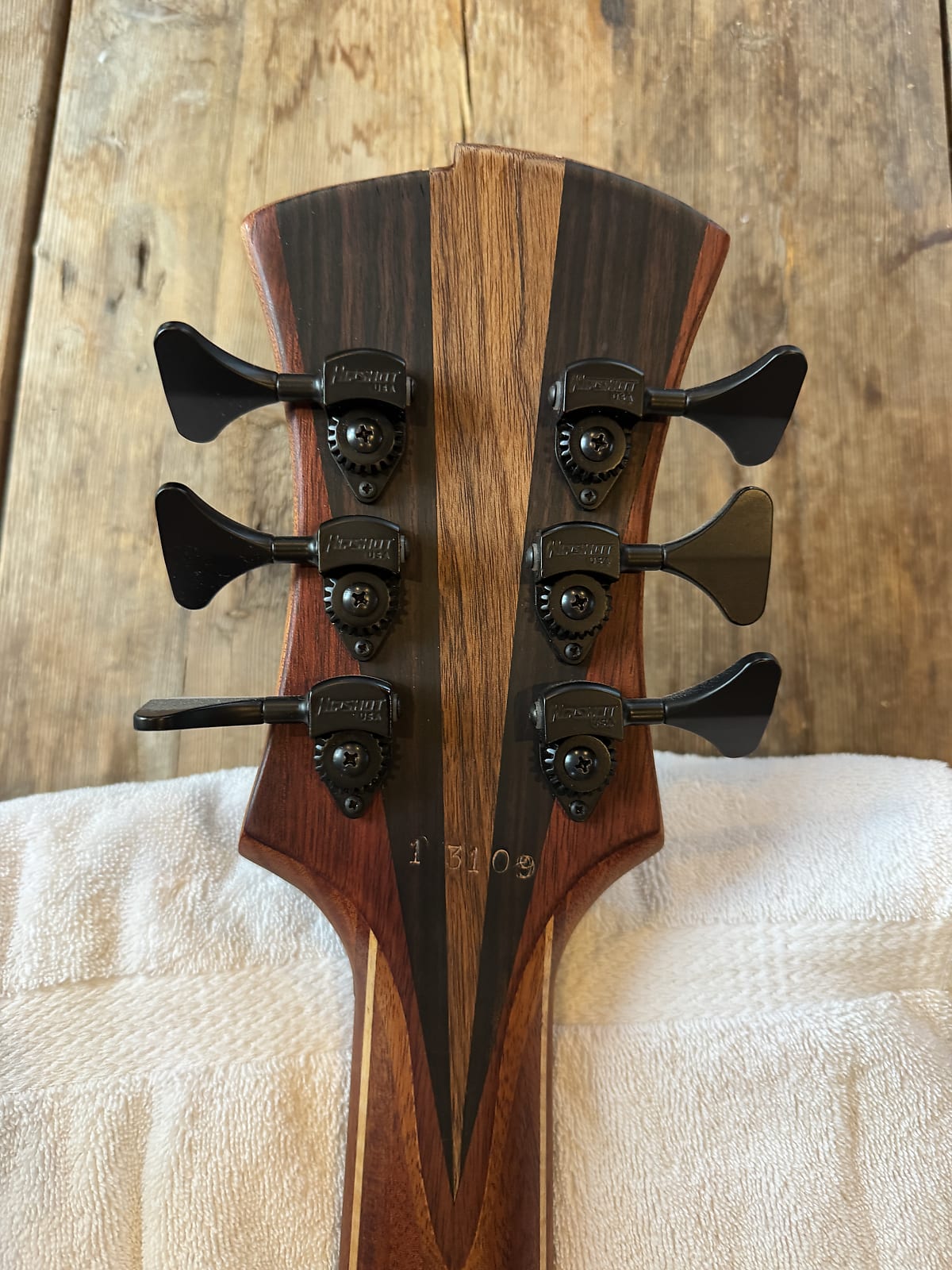 This bass is now owned by Mike Adams. Mike says, “…I did some work on the lefty 6 string that belonged to Dan Jackson. The bass has been upgraded with a 3 band Bartollini active preamp with pickups wound by Larry Pollack of Aero. The custom wood pickup covers, knobs and bridge were built by THG knobs.”