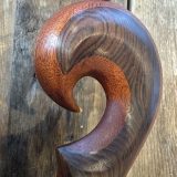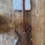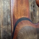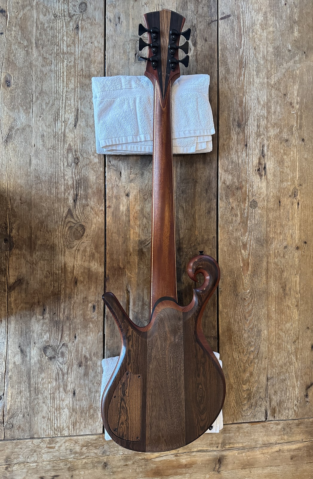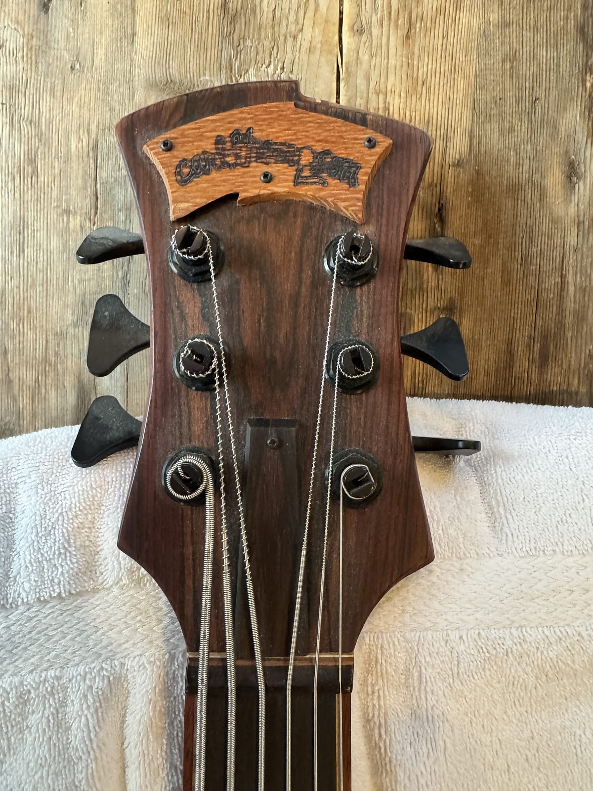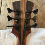 “Carl took a hiatus from bass building in the early 80`s. When he started on my 6 string bass, he just finished building Gary Kelly`s. Mine was the 2nd six string that he built after a lengthy break.. He hadn`t built a 6 string for many years, so he didn`t exactly exude confidence. He started construction in 1986, and it took him about 16 months to complete. It has an EMG P-Bass pickup in the middle and bridge positions, and a 40 inch string length (36″ scale). It also has a HAZ labs preamp . The controls are panpot, master volume, treble boost, bass boost. It`s all walnut, with a rosewood board and nut.. The serial # is 5/7/88, the first 2 digits are my birthday, the last digit the year the bass was finished.. We experimented a lot with string gauges. At one point, I believe I tried a 165 low b, but it was so heavy, it vibrated erratically. I went to a 140, and now, a 130. I can`t tell you how many people want to buy my CT Bass.”