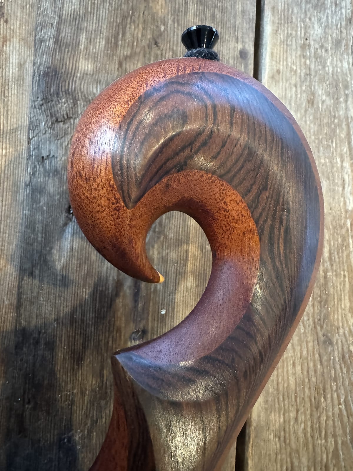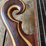 The bass Carl is holding is 2-5-80, while the curly maple 6-string is 2-5-77. This entry represents the foremost 6-string, which is a fretless a padauk-body bass likely made in 1988 or 1989 (‘1988_1’ above).