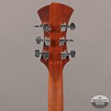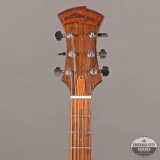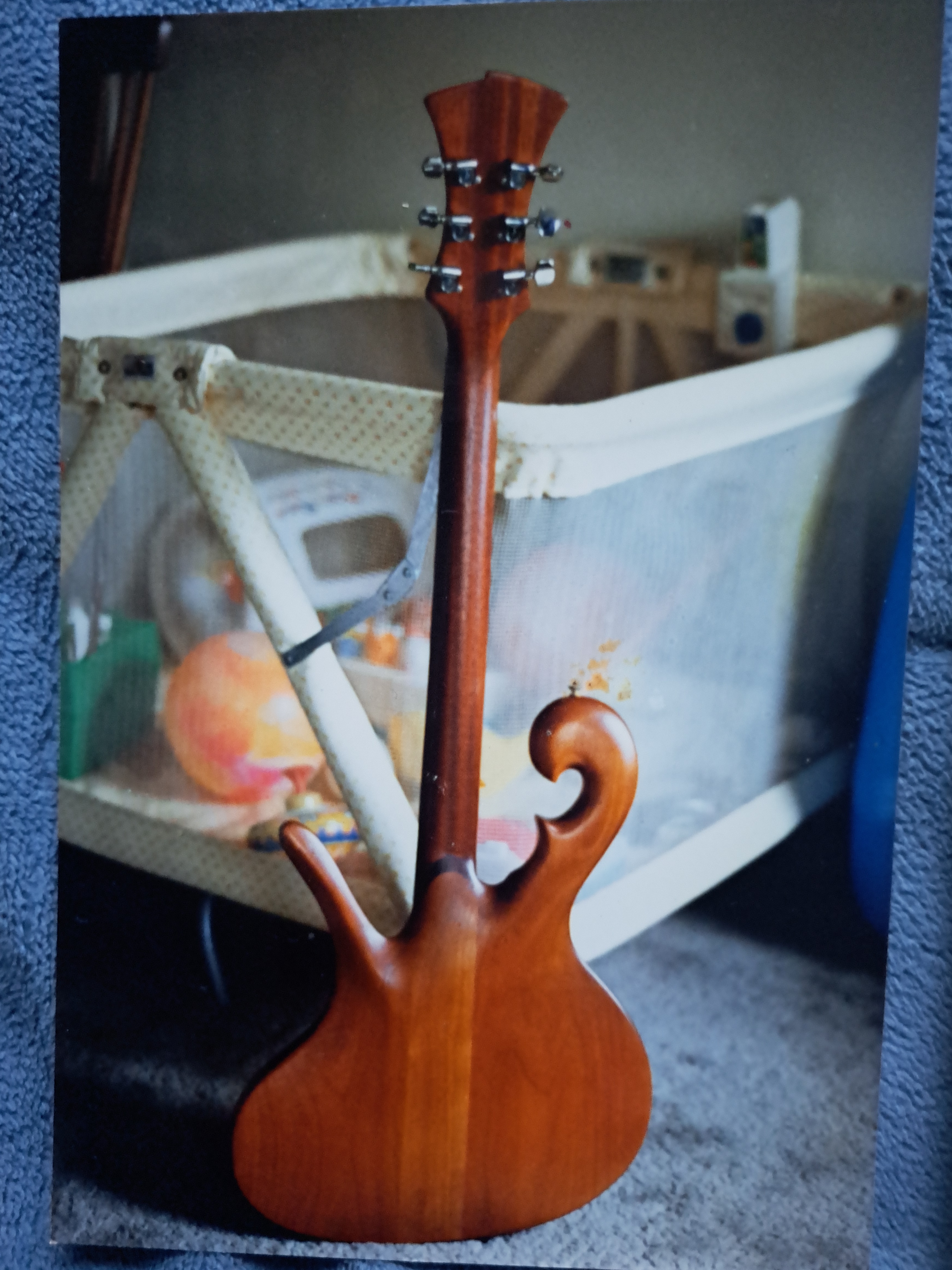 Here is what Mandolin Web has to say about this guitar: “Carl Thompson December 1994 7-string electric guitar, #12994, exc, O’Gigbag. All natural woods, with active EMG pickup. This is a huge electric solid body, being 16 3/4” wide at the lower bout and all that space is carved and contoured wood — looking very much like a six- string bass — made of cocobola overlays with walnut on the back and mahogany on the front – a veritable Walk Through the Rainforest. The peghead is cocobola overlaid with a maple banner wood-burned (as in woodshop) with Carl Thompson’s name. The banner echoes the shape of the headstock itself. Seven strings are played like a six-string guitar but there is a “low B” string added which increases the bass range by a fourth. In this instance Carl has chosen to substitute a single Gotoh bass guitar tuner to go with the six Schaller gold plated guitar tuners. The pickup is unique in that a) it’s flush to the top and b) it’s mahogany covered. The fingerboard is double bound in two types of woods. There are three-in-line knobs in the lower treble bout for the single pickup, the access panel on the back is also in matching wood, the brass one piece non-intonated saddle is floating and a simple brass pinless tailpiece holds the balls of the strings. The neck shape (2 3/16″ at the nut) is extremely low profile and flat, which makes for great playability. There are two strap holders, offset on the body to assist with balance. This is a novel and impressive instrument by one of New York’s better known luthiers.”