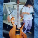 “Carl and I discussed a large-body shape, closer to a standard hollow body guitar size (16″-17″ across the”hips”) but, of course, in a solid body guitar. I don’t know if you can tell, but it’s a pretty big guitar; I am 6’2″, and as you can see in the photo of me playing, it covers a lot of my body). I asked for an ebony neck and a light shade of body wood, but that was about as specific as I got. I also opted for a slightly longer (26″) scale length and requested a slightly wider-than-average string spacing. The guitar top is quilted maple, and the body is Honduras mahogany interspersed with thin pieces of dyed poplar (several green and one orange just below the quilted maple).The fingerboard is ebony and the neck is maple, and the headstock is padauk. Sperzel locking tuners. The pickups are Kent Armstrongs. I can select either one or both, and both are humbuckers that can be split (by means of a toggle switch) to single-coil. Electronics are passive. The guitar basically sounds and plays like a dream, and Carl set it up with perfect intonation, as near as I can tell.”