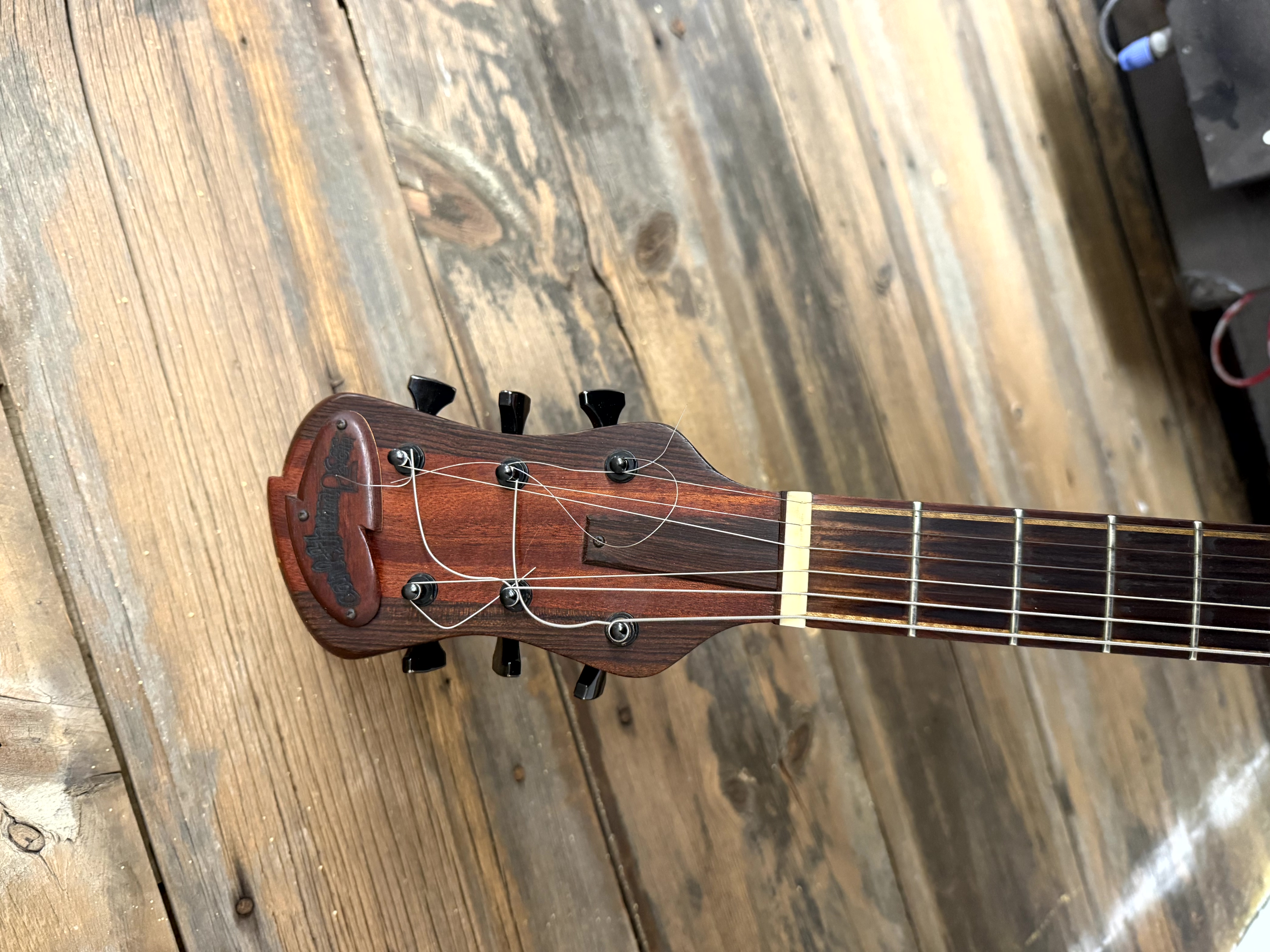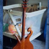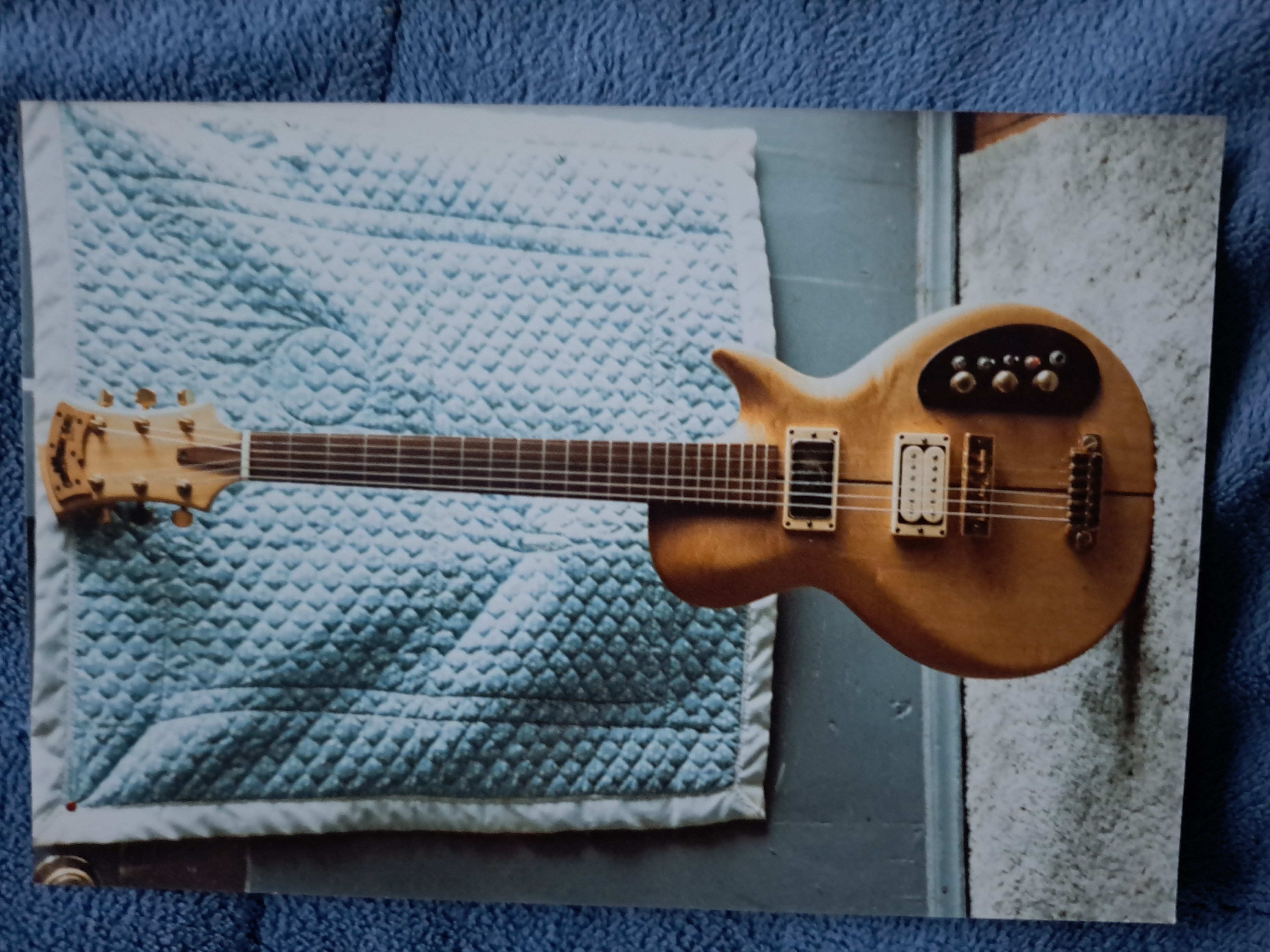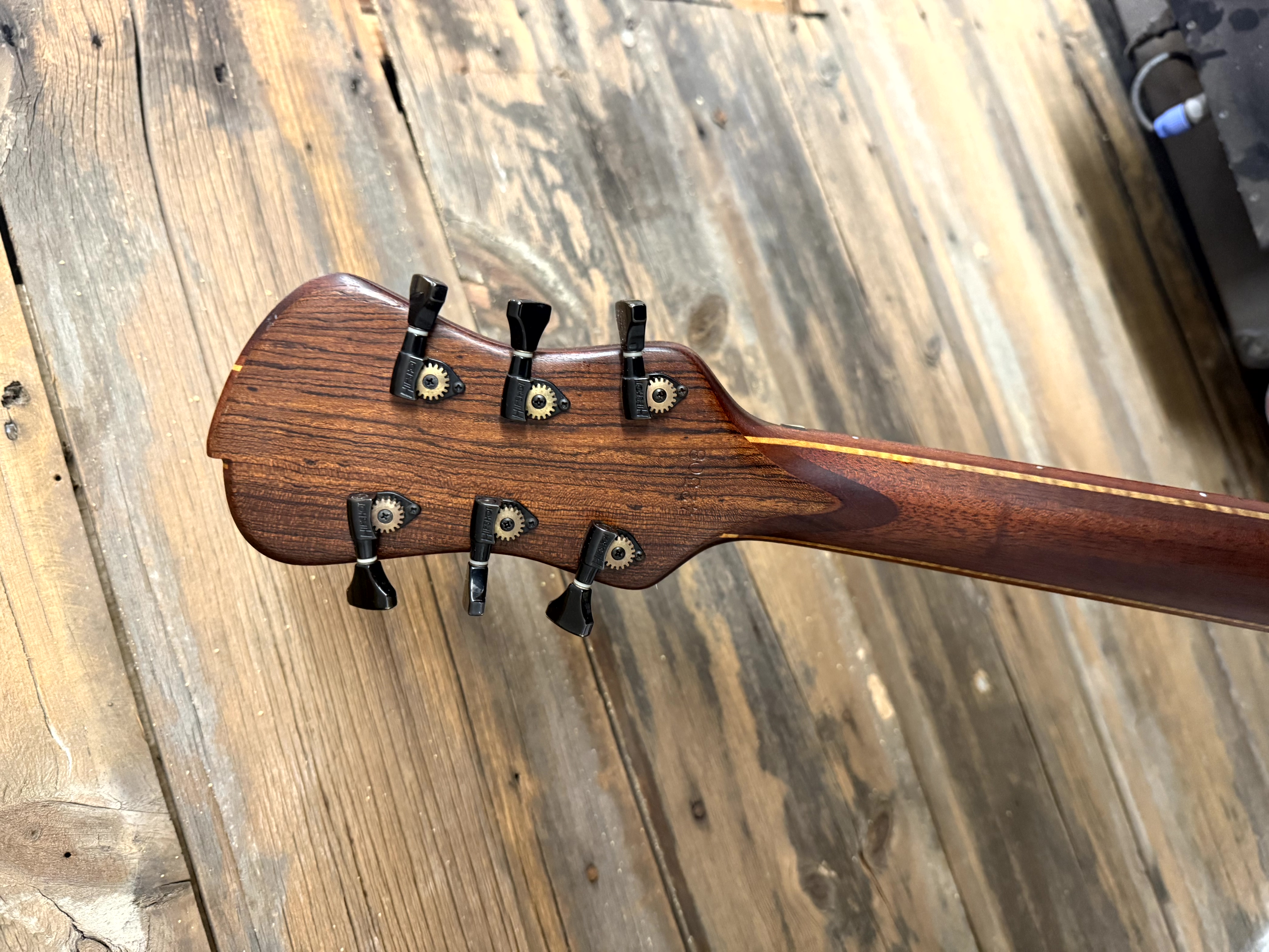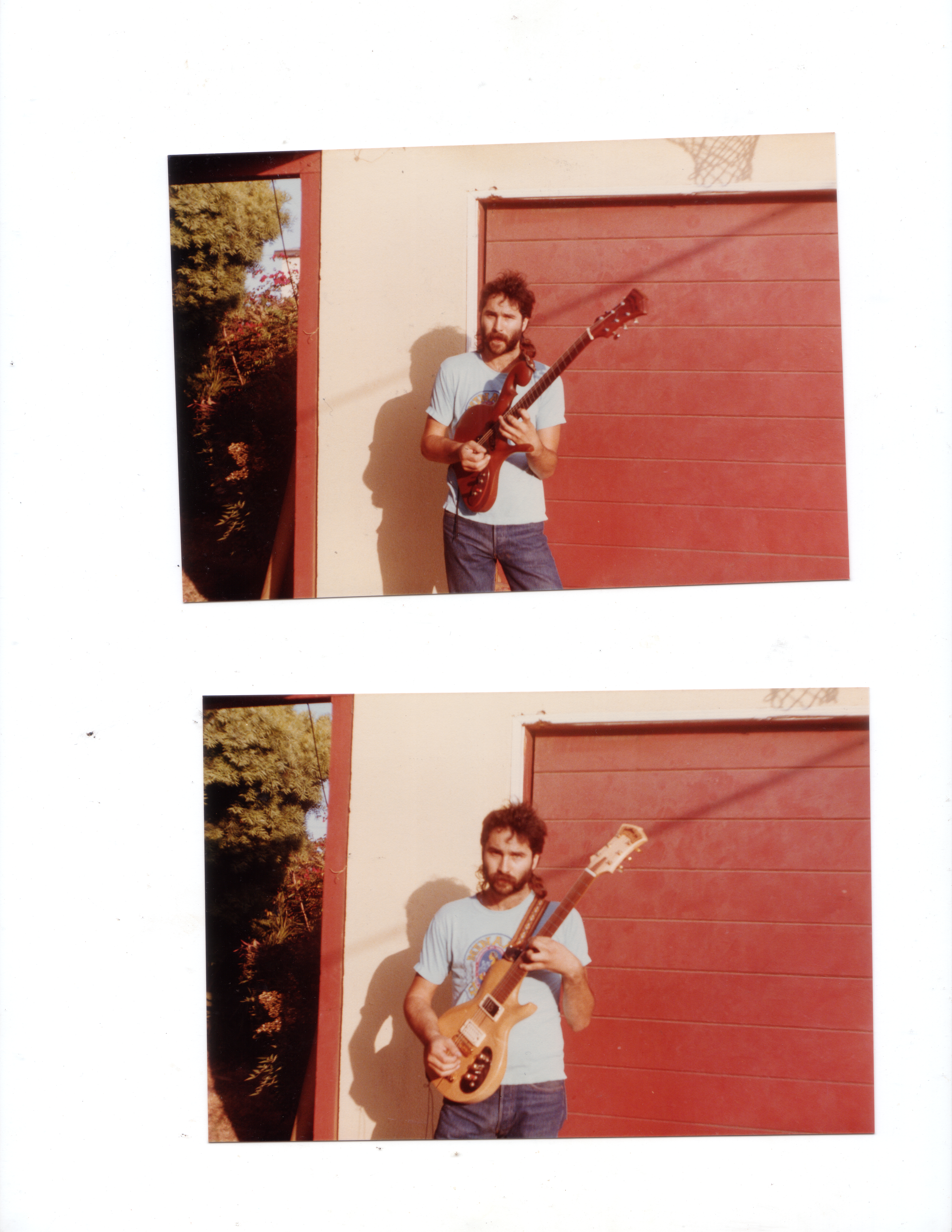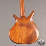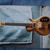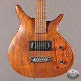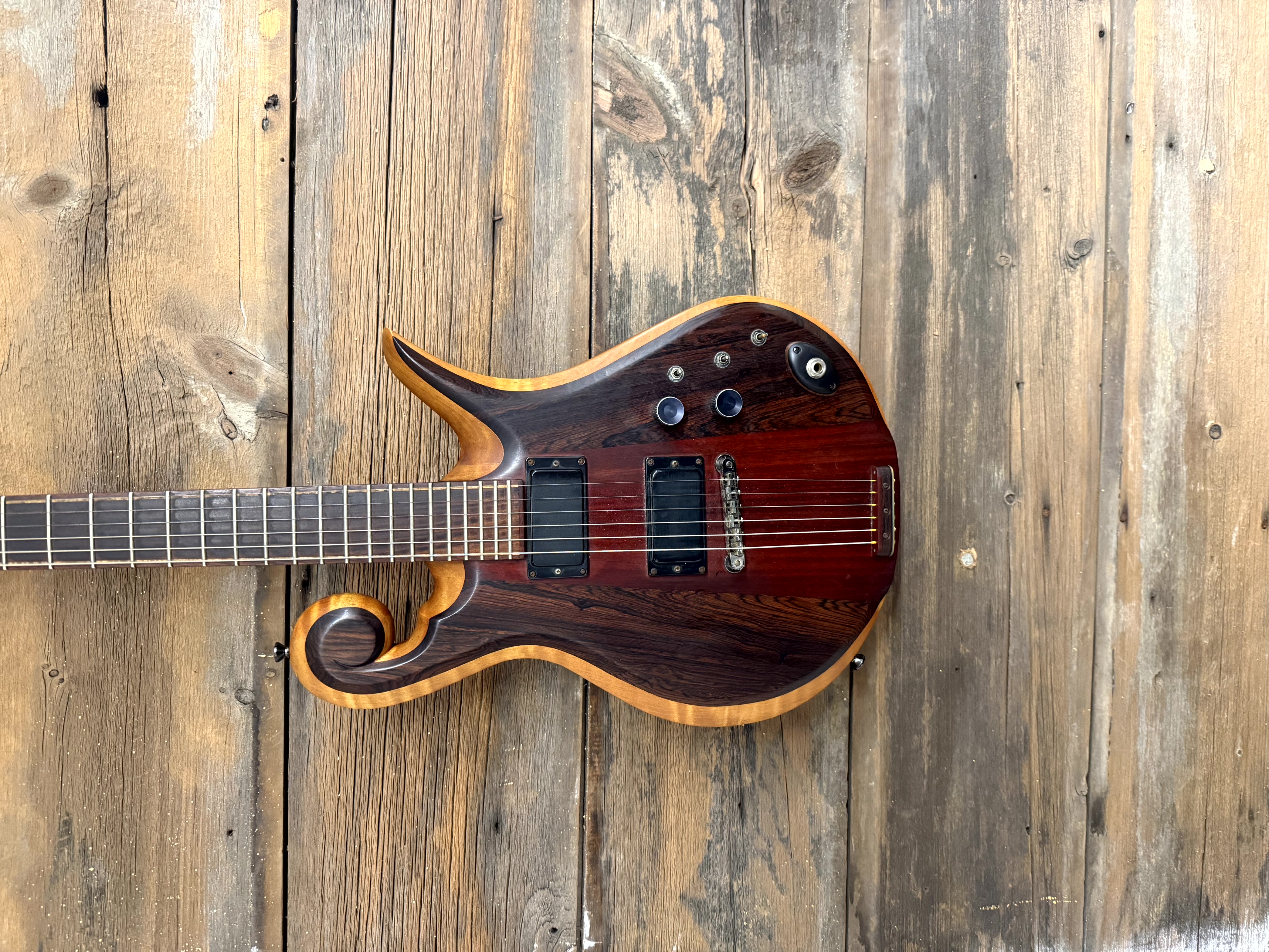 The guitar is now owned by a gentleman named Mark Shahzad, who recently received an 8-string bass from Carl. Mark purchased the guitar in Arizona but has recently moved to the Brooklyn area and brought the guitar back to the shop for Carl to clean it up. The control plates on the front of the guitar are not original and were later added by another owner. Note the unique Zebrawood triangle inlay on the back of the guitar and the rare body shape.