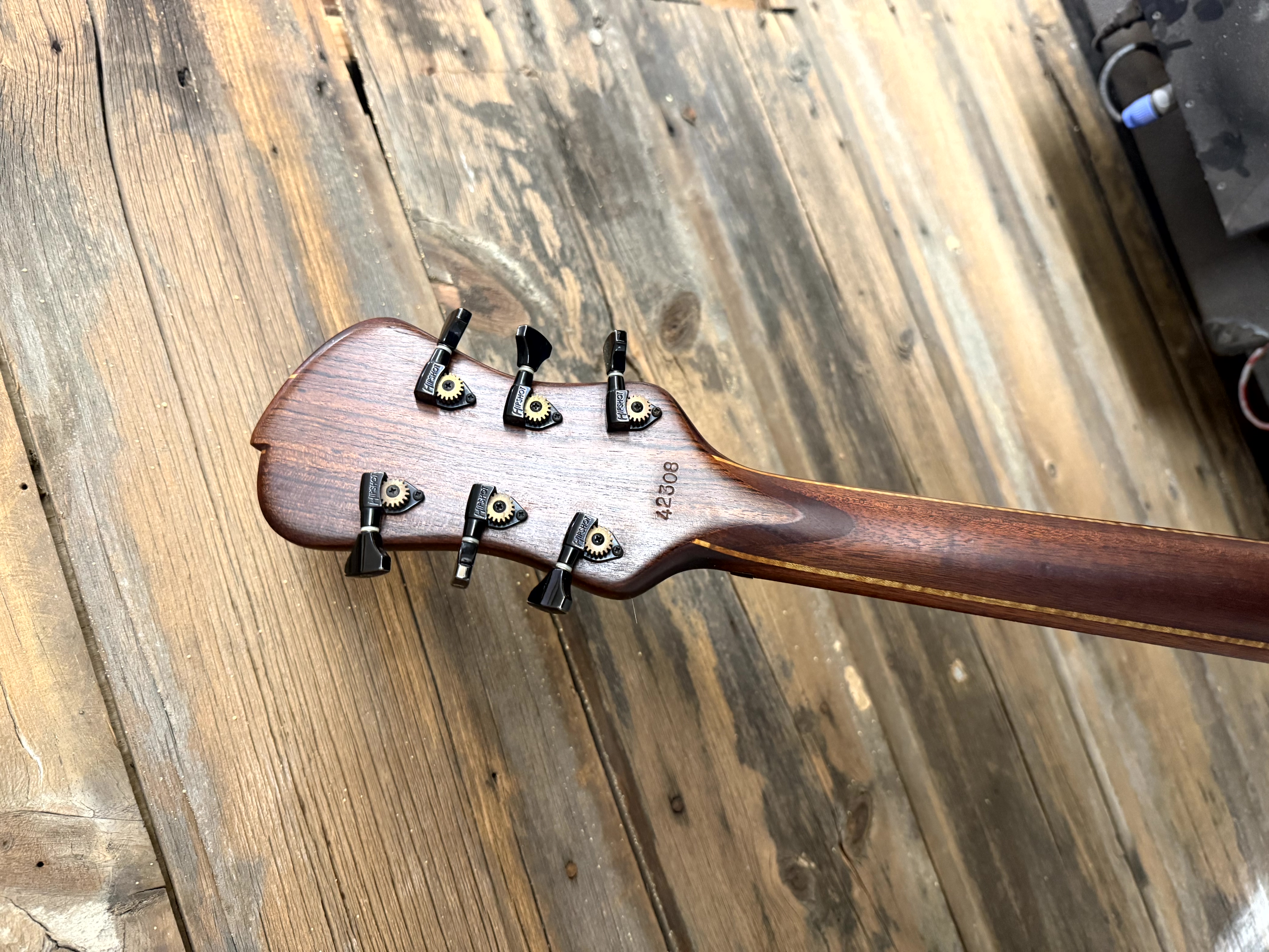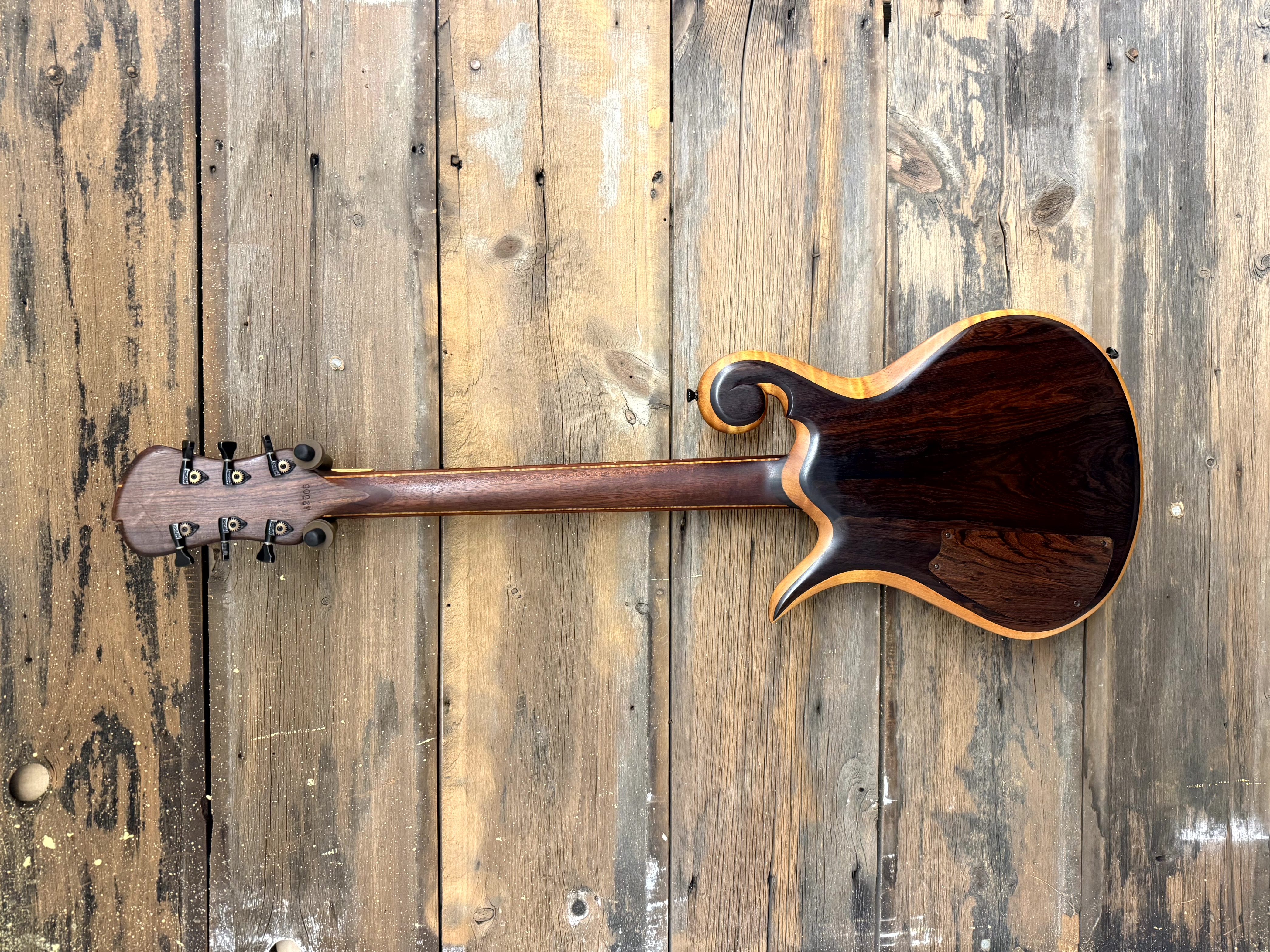 -curly maple neck with cocobolo stripes and a macassar ebony fingerboard, ebony vineers on headstock